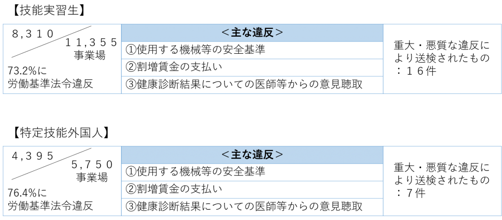 厚生労働省は、2025年9月に外国人技能実習生または特定技能外国人を使用する事業所に対する令和6年の監督指導 、送検等の状況を公表しました。特定技能外国人に関する数値は初公表となります。