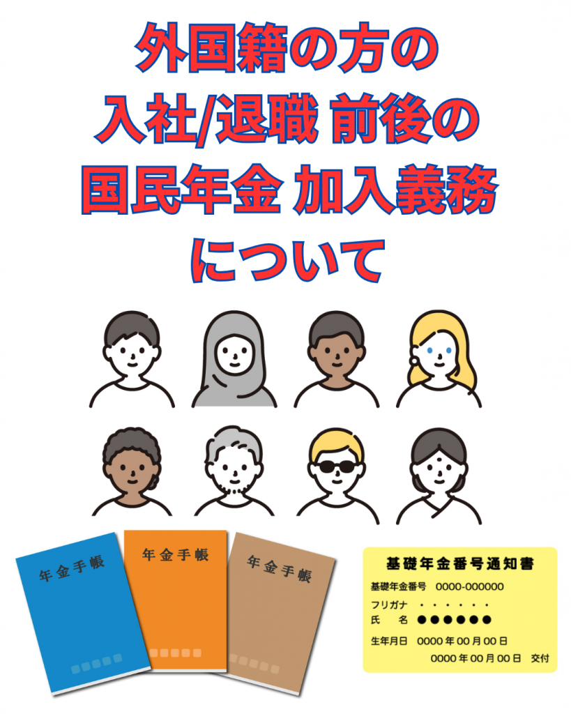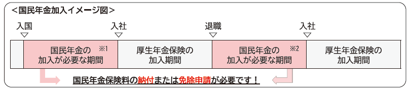 よって、外国籍の方が日本に入国し、厚生年金保険に加入する場合、               「入国から入社(厚生年金保険加入)までの期間」(下図※1)や「退職により厚生年金保険の資格を喪失した後の期間」(※2)は、国民年金に加入し、保険料を納付する義務があります。(社会保障協定等により、日本の年金制度における被保険者とならない方を除きます。ただし、従業員の方が、社会保障協定を締結している国の国籍の場合でも、従業員ごと手続きが必要となります。)