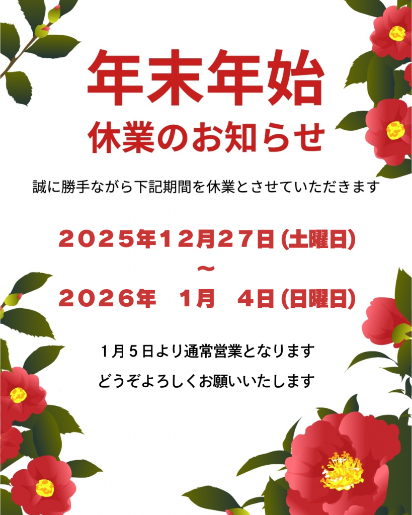 2025年12月27日(土曜日)より2026年1月4日(日曜日)を休業とさせて頂きます。